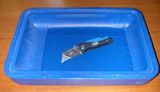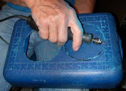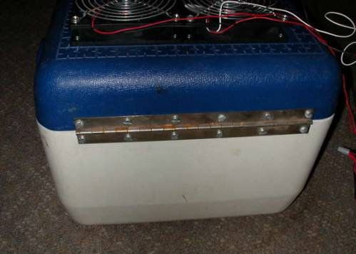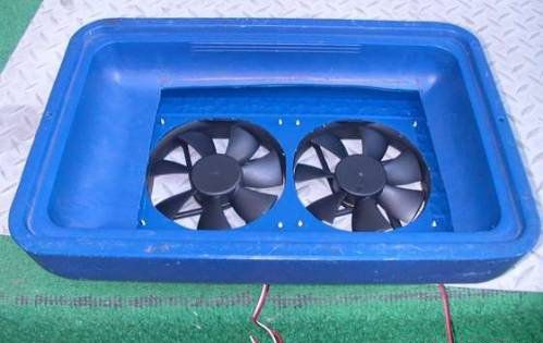 Make a square-shaped cut-out in the inside of the cooler bag’s lid and then two round cut-outs to fit the fans on the outer side of the lid. Screw down the fans and splice together their wires.