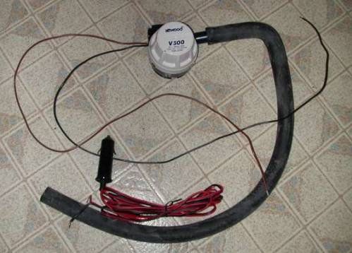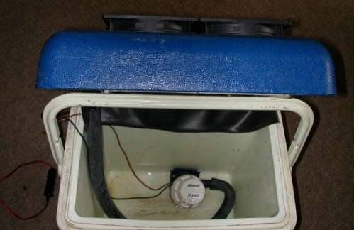 Secure the pump on the bottom of the cooler bag. By the way, it can be an aquarium pump or windshield washer pump. Drag the cables out.