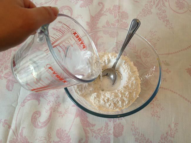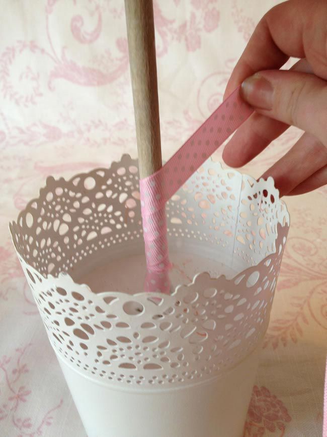 Make the gypsum mixture and run it into the flowerpot. When the mixture begins to thicken, insert the spoon with the wide end and hold several minutes. When the basis is fixed, you can proceed with the next stage.