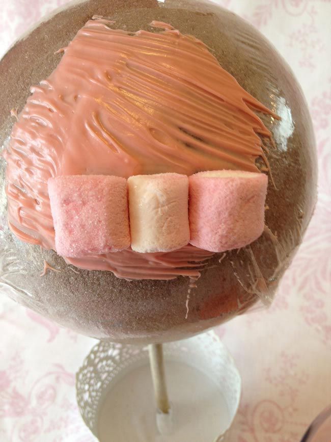 With the help of a brush, apply chocolate with small areas and attach marshmallow firmly.