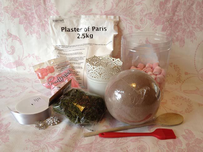 Well, the sweet part of the tree is finished. Now begin with the body design. Pass it round the ribbon and attach it. Cover the bottom with the artificial moss.
