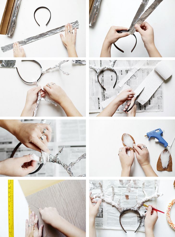 Fold aluminum foil into large strip. Wrap strip around headband and then twist and shape into antler shape. Repeat for second antler. Add smaller spikes to the large ones by using the same steps with smaller pieces of foil. Once antlers are the shapeyou’d like, cover foil with pieces of plaster wrap (following the directions on package). Let it dry. Cut two ears out of the felt and cut smaller pieces of the fur to fill inside of ears. Glue the fur to the inside of the felt, then fold and glue the bottom of the felt in order to create ear shape. Once plaster is dry, paint the antlers as desired. After paint is dry, glue ears to headband.