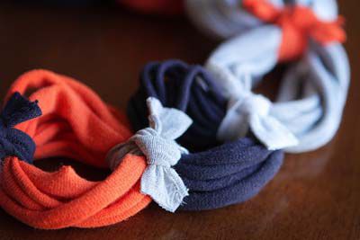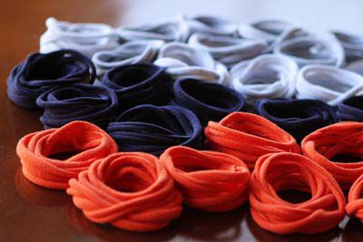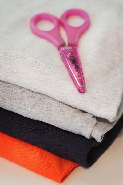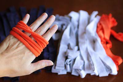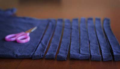 Cut off the edge of each T-shirt and cut into strips of identical thickness.