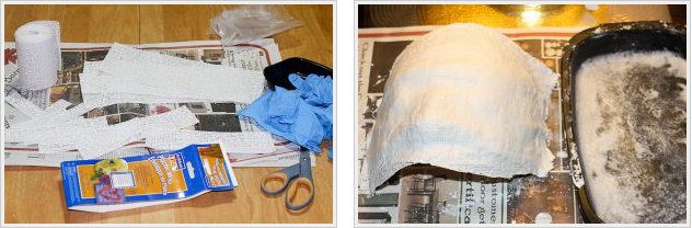 Firstly, let's see how to make a plaster Venetian mask: you will need plaster bandage, water, rubber gloves and a helper. Plaster bandage needs to be put right on the face. Grease face skin, lashes and eyebrows with vaseline, soak the bandage in water a little and cover the face with a few layers, following all curves and shapes. Leave it on and breathe with mouth for about 20 minutes until the bandage solidifies.