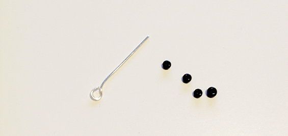 The third step. We make a connective element for an ear hook and the base of the earrings. In order to make it we take 2 bijouterie pins with that have a loop on one end and start threading 4 beads on each of them. The free end of pin we need to twist in a loop and cut off the excess.