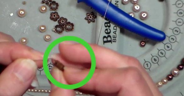 3. Put through the end of a thread into a fastener. Then move a combination of a bead-crimp-a bead and use chain-nosed- pliers (pliers) to clamp a bead into crimp.