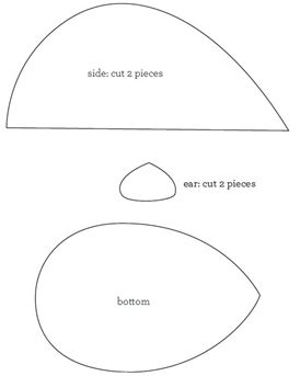 Cut out one lower and one side part at first, you can cut out them from the same piece of cloth or use different. Then turn the template over for the side detail and cut it out, too. To make a mouse tail, cut out a strip of fabric of 2,5x10 cm. This strip has to be not squared, but with inclined sides, as it shown in the picture.