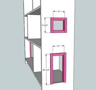 3: Windows and doors. At first build window and doorframes, as it is shown above, using 1 ½ nails. Then attach frames with the help of nails to the cut-out openings. If you prefer to paint frames and shelves in different colors, then you can attach frames at the end, after painting of the house.