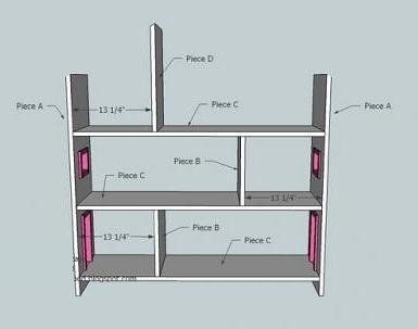 4: As soon as you have finished working on the side A. We start working on the central part. Connect boards B and C with nails, as it is shown above. Then attach D to the top shelf. As soon as you have assembled parts B, C, and D, attach part A to them.