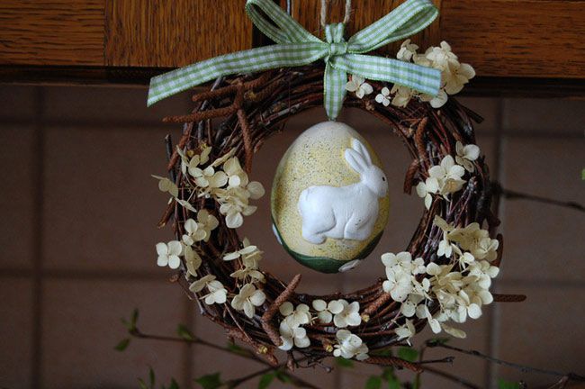 3. Take a ribbon and attach the egg to the upper part of the Easter wreath.
