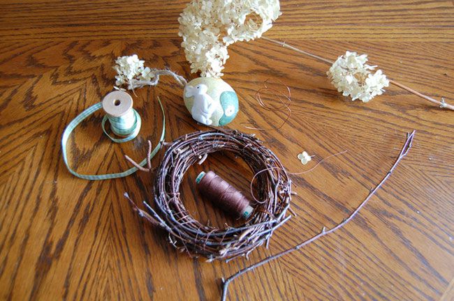 1. Shape the branches to make a wreath by joining them together with a wire in several places. Use a thread to ensure the wreath won’t break.