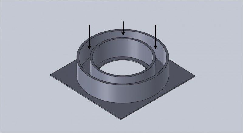 Our sculpture comprises of two circles. You have to use peculiar molds to create them. This method does not allow casting in closed molds since water expands when it is frozen. That’s why you need to use open molds. The picture shows the first mold design. The arrows indicate the place where water is poured. The mold №2 will embrace the mold №1 as it is shown in the picture.