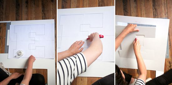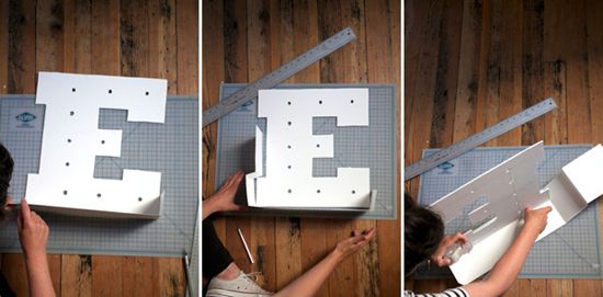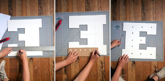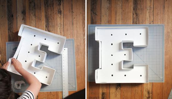 Out of it we cut out our letters on the patterns with the help of a knife and a metal ruler. On the resulting letters, you will need to mark and drill the holes for the bulbs. They should be placed at the same distance from each other and hole diameter should be less than the diameter of the cartridge for a lamp so that backlighting does not fall out.