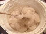 Pour the lye water into the oils’ mixture. Temperature difference between the lye water and the oils should not exceed 5 degrees. Using your stick blender mix the mixture until it reaches thick trace. I brought my soap to a very thick trace. Put the soap into the oven. Stir it every half hour.