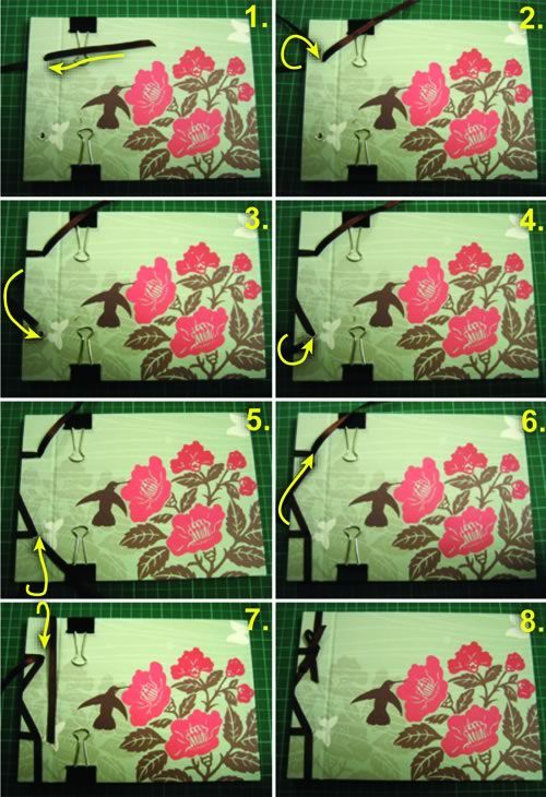 Step 9. Now bind all the details with the ribbon. It should be six times longer than the albums’ height. For example, if your album is 15 cm, you’ll need a ribbon 90 cm long. Tie the ribbon as shown in the picture below.