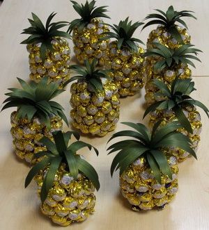 To make a pineapple from chocolates, you will need ordinary truffles packed into foil. It is desirable to choose chocolates in yellow or brown wrap, in other words, it should be like the pineapple peel. After that, take the tissue paper of yellow color and cut it into identical squares. The size of squares depends on the size of chocolates.