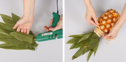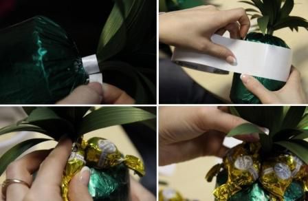 When leaves are ready, glue them to the bottleneck, where the foil is stuck on. The spaces of the connection of leaves and chocolates can be decorated with the help of a twine. Your pineapple is ready.