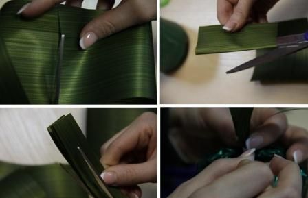 After that, take the tissue paper of the green color and cut leaves for the pineapple off it. It is desirable to fold the paper in several layers lest it tear.