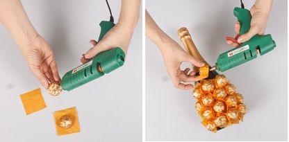 Take a decorative ribbon and cut leaves for your pineapple out of it. After that, fix them in the upper part of the fruit and decorate them by the ribbon. You need to glue the entire workpiece with a duplex adhesive tape, then the chocolates can be attached without a glue pistol.