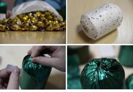 If you did not plan to gift a bottle of champagne, but would like to present chocolates in an unusual manner, try to glue them on a prepared foam plastic form.