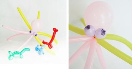 If you like creating big articles, try creating an octopus. In order to make it you’ll need several balloons of a different colour. Take one round balloon of a middle size. it will be the body of your octopus. You’ll have to fasten 2 small balloons to this balloon. They will be the eyes of the octopus. You may decorate them with the help of a felt – tip pen or a piece of paper.