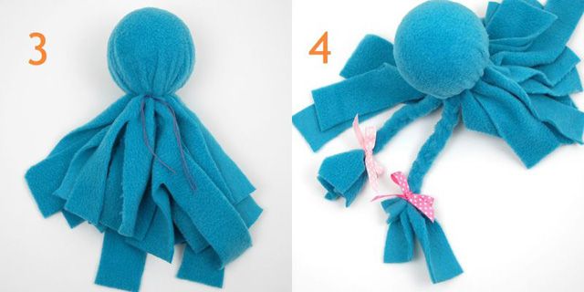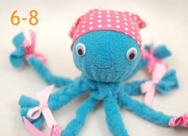 A few stitches of red or pink thread are enough to make a smile of our octopus. The last stroke - we wrap the toy’s head in spotted fabric and we fix it from below, forming a bandana. Congratulations, you have just made an excellent toy with your own hands!