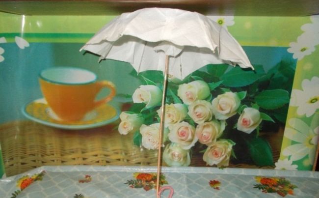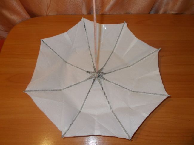 You will need eight pieces to assemble the umbrella. You need to glue them to the axes and, if necessary, cut the excess of paper. Wrap the handle with a thick layer of transparent tape; it will make it more durable.