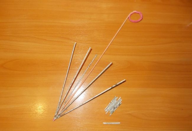 Step 4. On the photo below you can see an umbrella with eight tubes of the same size. Now you need to take the gum 1.5-2cm thick and fix it on the handle closer to the umbrella, then attach eight of these small tubes to it, gently pressing them with tweezers.