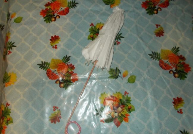 Glue the small curl on the top of the umbrella to hide any possible defects and attach two big ones to the rubber in the bottom (rubber attached to the handle), creating a kind of a skirt: