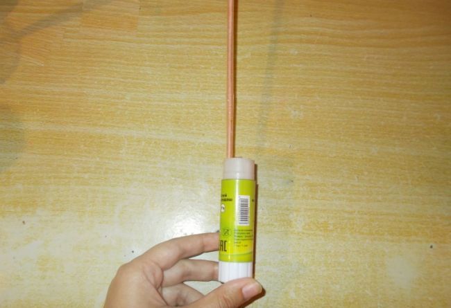 Now you need to glue the handle (after I covered it with a layer of tape it looks smaller) I take an empty pack out of glue-pen and insert the handle in it, and then cover the cap with two layers of crepe paper and tape.