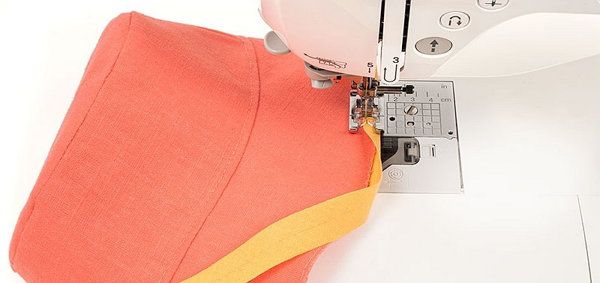 Edge the outer edges using the bias binding. Open the binding, tuck the allowances and pin this side to the outer edges of the brim face to face beginning from a seam at the hat’s brim. The binding’s fold and the edge should match. Pin them. Turn the binding to the other side, tuck the allowances and pin them. Then sew all the layers tucking the binding’s ends. Sew the edging with the yellow thread up to the allowances’ edge.