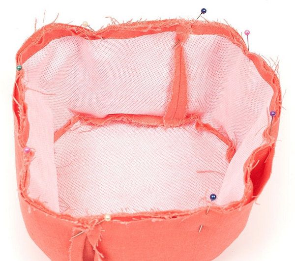Mark with pins four similar segments on the outer crown and bottom details. First, fold the details in half across, pin them along the folds. Then fold them across once again and pin them along the folds.