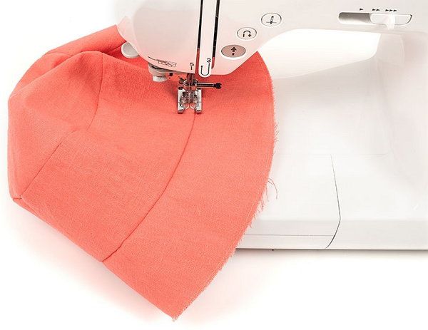 Mark four similar segments the same way as in the step 4. Put the brim inside the hat and pin them face to face to the lower edge of the hat’s outer part matching the pin marks with the crown seams. Sew the seam around.