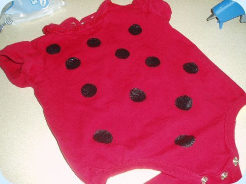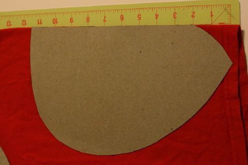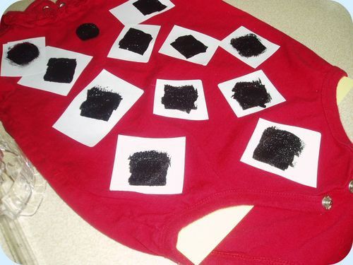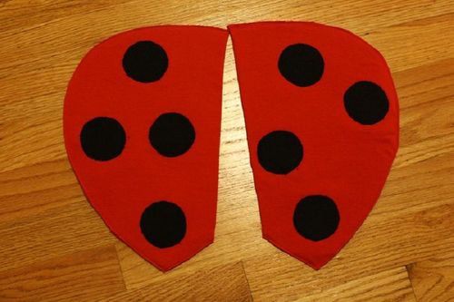 Meanwhile you can start creation of ladybug wings. Cut out a template from a paperboard and outline its contours on the fabric. Cut out 4 patterns and paste them over the costume basis.