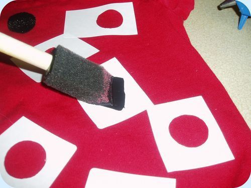 Begin with creation of a costume basis as it won't be long before it will have dried. You may use a red T-shirt, bodysuit, or blouse as a costume basis. Cut out 7–10 patterns in the form of circles from ordinary printing paper and place them on fabric. Apply black gouache onto the fabric with a brush or a sponge.