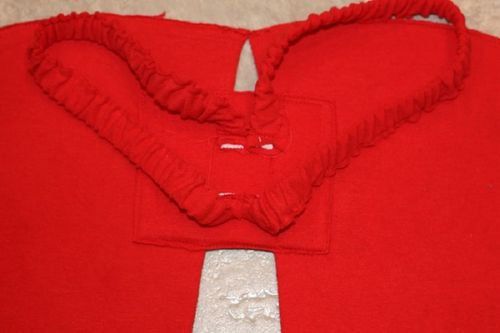 Create a small tissue square from the remained red fabric and attach to it the elastic bands which are previously sewed round by fabric. Fix this assembly on the ladybug wings by means of hot glue.