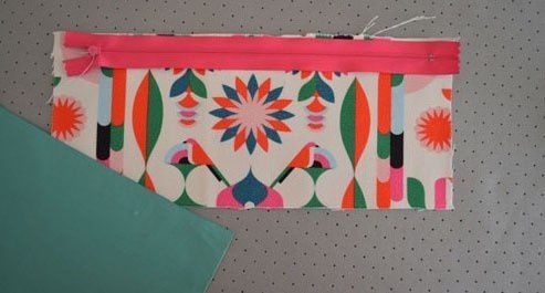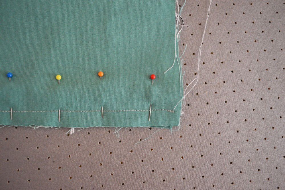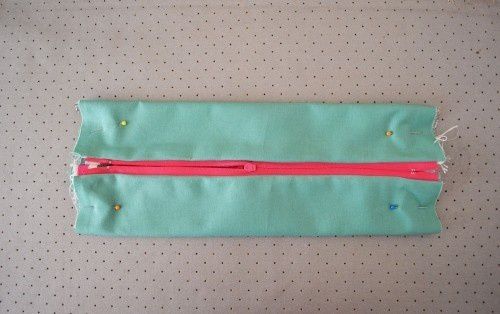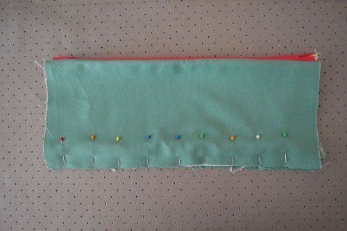 We fasten the details with each other. In order to do it we put the base fabric in front of ourselves with its face side up. We put a zipper on it. The edges of the fabric’s long sides and the edges of the zipper should be strictly aligned. We put the sample made of the lining fabric on top of the details. We fasten the whole construction with pins. Everything should be the following way: there should be one side of the zipper fastened in between the two textile details.