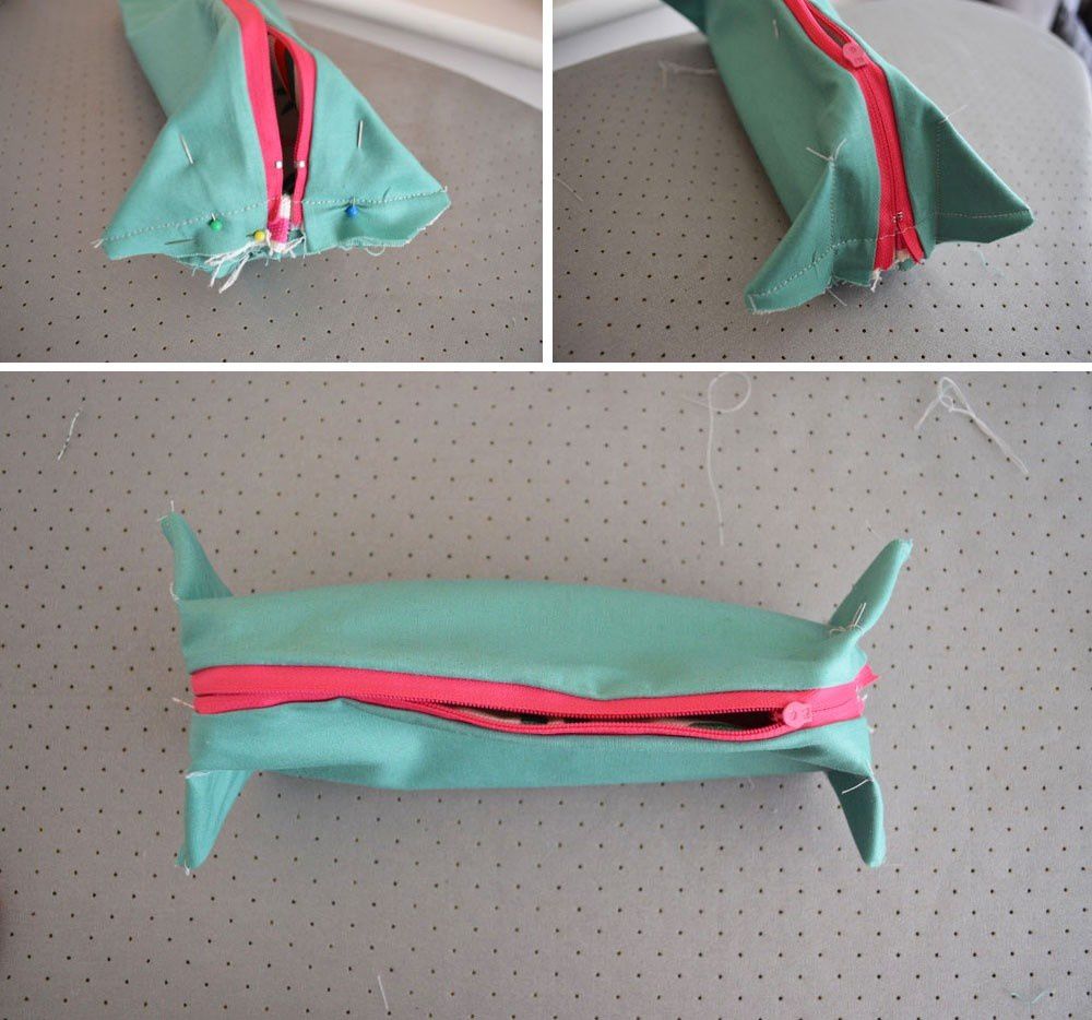 Put the article in front of yourself so that the zipper is located in the middle. Unzip a half of it. This way you’ll get the “pawl” of the zipper aside and it won’t disturb you when you get to working on joints. Fasten the side details of the makeup bag with each other with pins. Create joints on the sides of the makeup bag. go back from the edge on 1-1.5 cm.