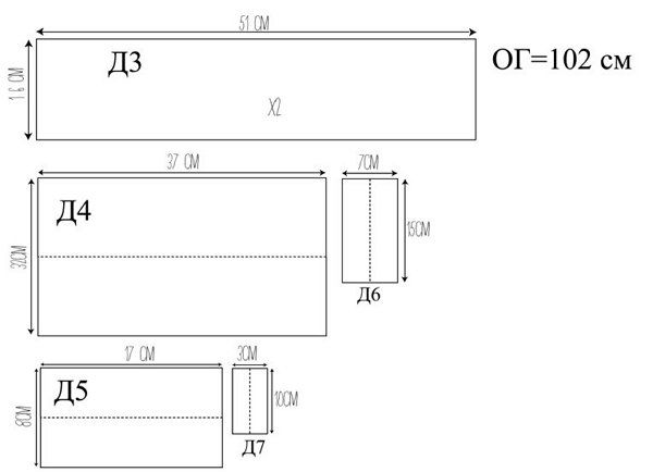 Cut out the top details from the fabric: D3 – 2 pieces, D4-D7 – 1 piece for each one, with account of a over-measure allowances for round stitches of 1,5 cm.
