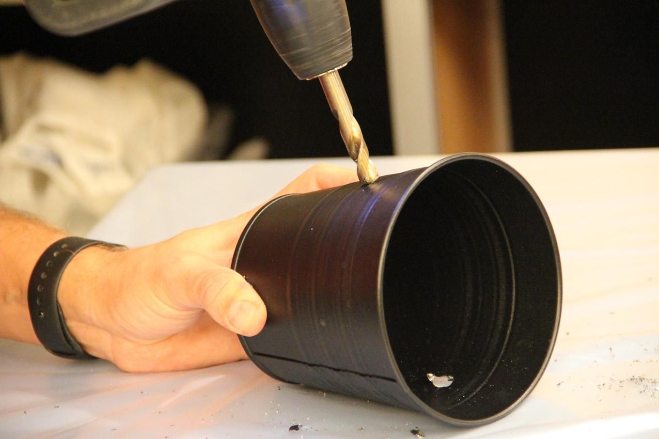 Now, drill in the flower pot two holes: one - for the electrical wire, the second one - for mounting the "trunk".