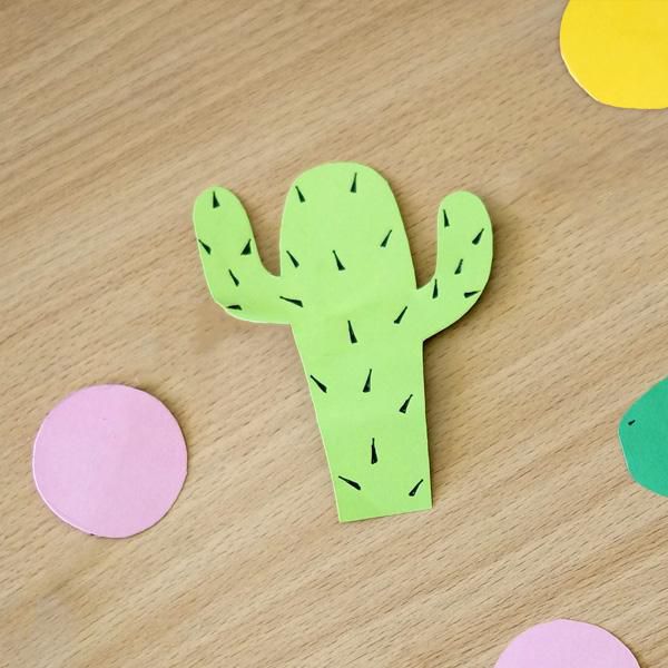 Then you should cut cacti out of green paper by the templates, and circles out of yellow and pink sheets. Draw spines on each cactus using a black pen or marker.