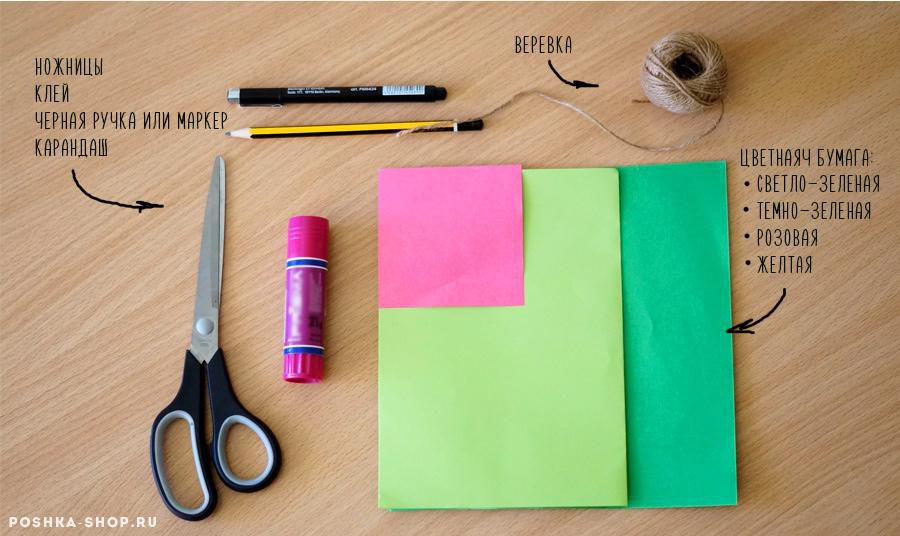 - several sheets of colour paper: light and dark green ones, pink ones and yellow ones
