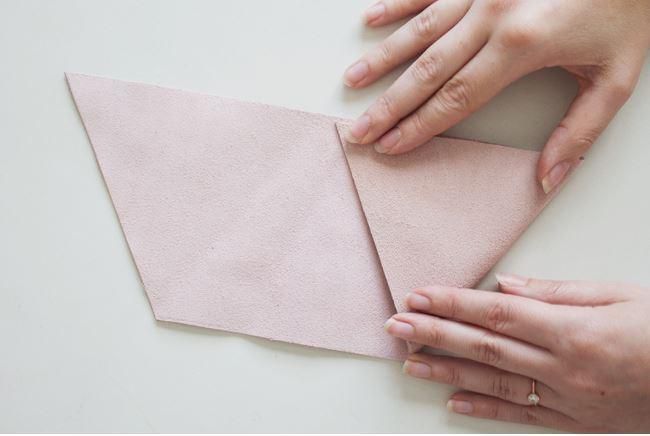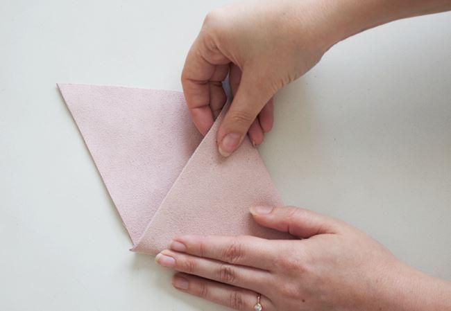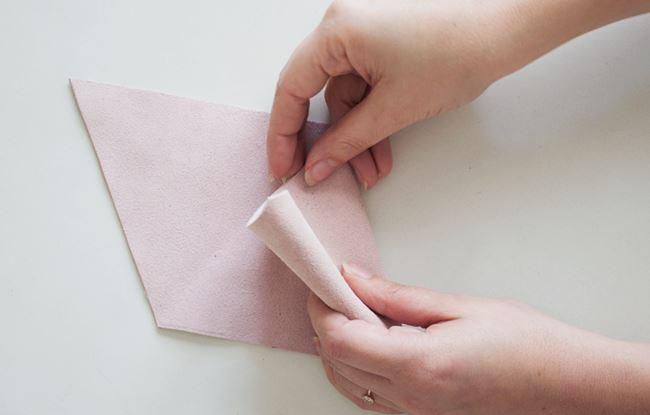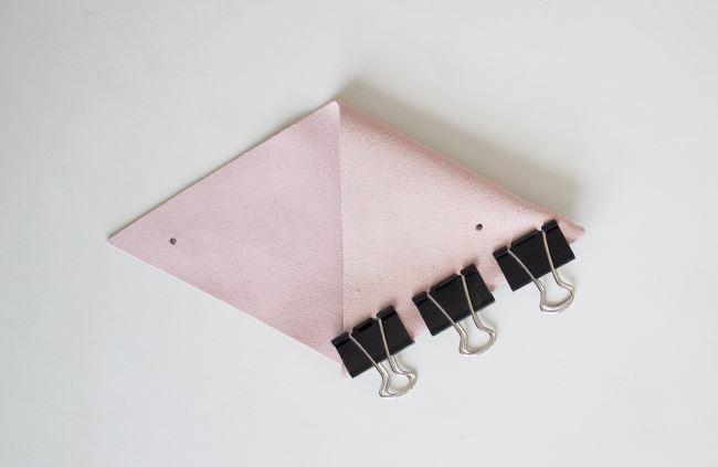 Unfolding a leather "pocket", you have to apply some glue on a triangle, which is lapped, and then clamp the fold line using clothespins or clips and leave until the glue dries.