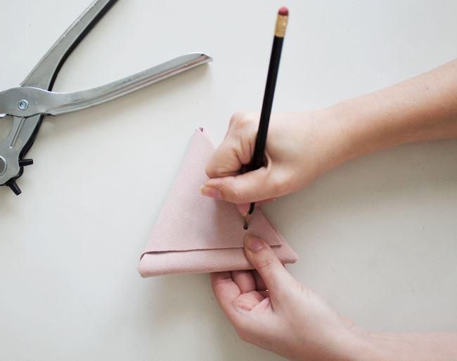Then, fold the piece of material back into the pocket and mark the place where you are going to punch a hole in the valve, and then, actually, make a hole using a hole puncher.