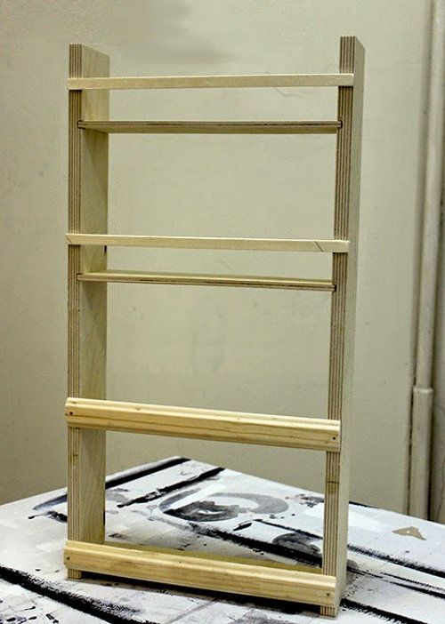 Color the shelf with acrylic paint twice. Let it dry and finish with acrylic lacquer. Attach the mounting hooks to the sides of the rack. Mark the spots for fixation on the door of the rack, insert the drywall screws and hang the rack.