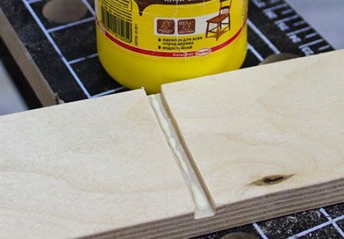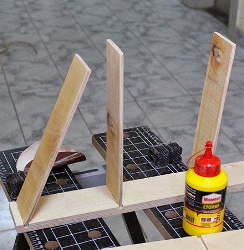 Apply wood glue inside the grooves and place the shelves in (rectangular pieces of plywood 70x270 mm). Wipe the extra glue with a soft cloth. Check if the shelves sit neatly and leave it to dry for a few hours.
