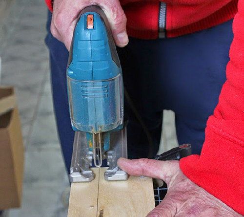 Measure the plywood and cut out the pieces with a coping saw. Carefully cut off the planks. Sand the front edges. Mark the following measurements on the side walls of the rack starting with the 70 mm from the bottom: 10 mm, 150 mm, 150 mm, 150 mm.