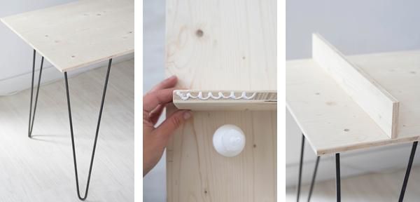 Try, how you want to place the table skirtings of the sections, so that you could get open desk drawers. Make marks with a pencil, then apply some glue and attach to the bottom of the tabletop. Apply glue to the upper cuts of the skirtings and cover with the upper tabletop. Tighten all the clamps, and make sure to place unnecessary plywood offcuts.
