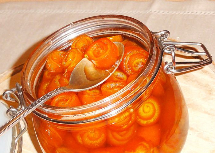Let the jam to cool completely, add the lemon juice and simmer again for about 30 minutes. That's all! The wonderful orange peel curls are ready! Bon Appetit!