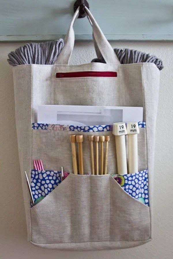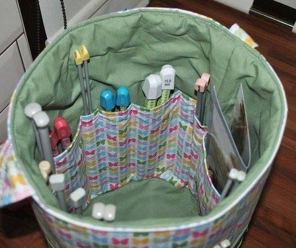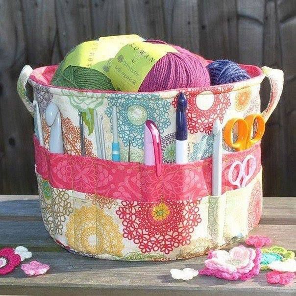 For knitting and sewing, baskets are also very convenient, with the sewn pockets for tools outside or inside, and inside you can put yarn, for example, or fabrics.
